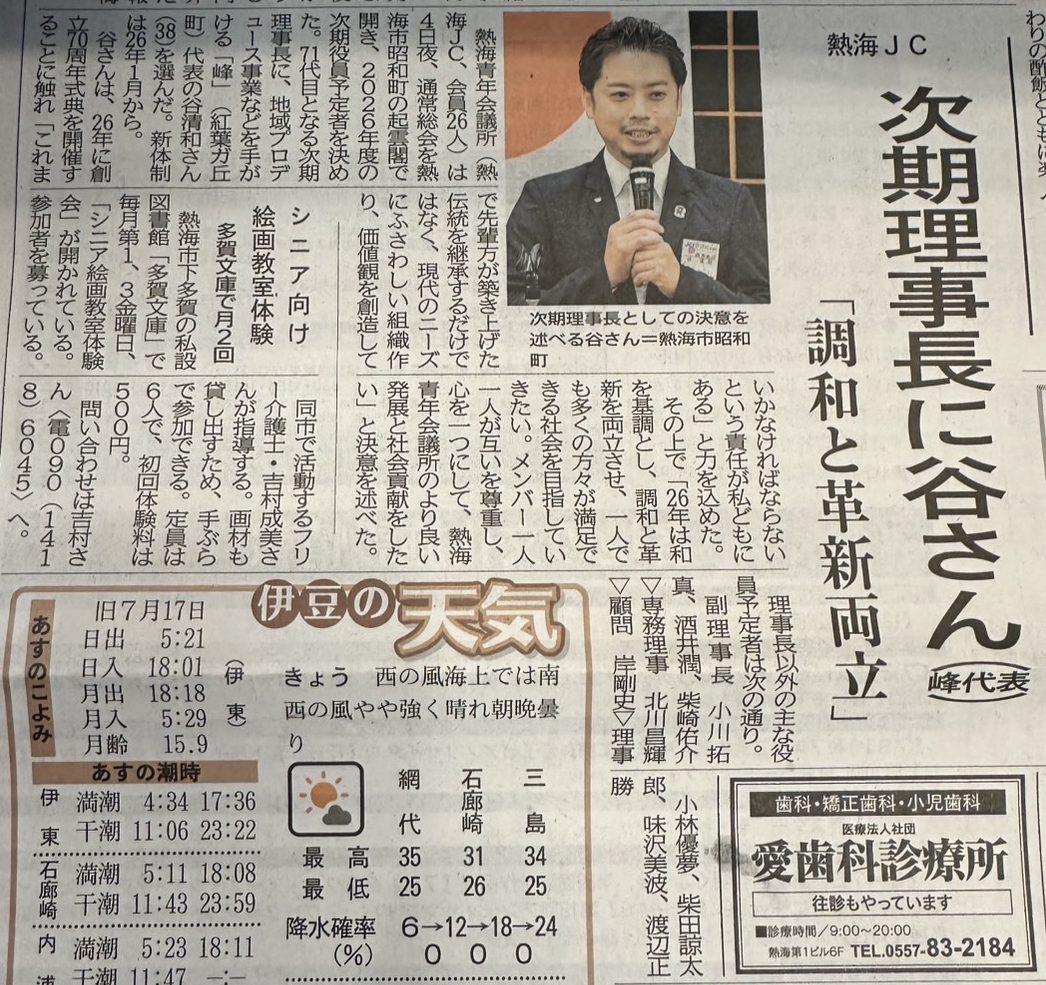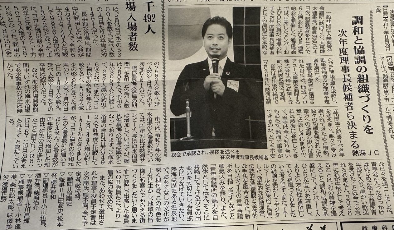 2025年9月4日(木)、熱海青年会議所の総会にて、2026年度理事長として弊社代表の谷清和が選任されました。